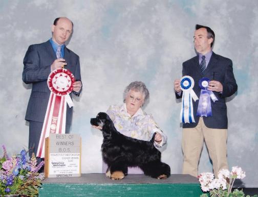 Ch. Silverhall Saturday Nite Live Ch. Somersets Ridin High x Ch. Silverhall Seductive. winning BOB her first time as a special. She finished her championship in 6 shows with one defeat. Winners at SNJCSC under judge Sam Houston MacDonald, WB at MdCSC judge Nina Dee, WB Md CSC under judge Olga Evelyn WB Md. Sporting dog judge Charles Self, WB BW, BOS to BOB to finish at CSCRI under David Flanagan and then next day was Best of Breed under judge Olga Evelyn. March 2012 |